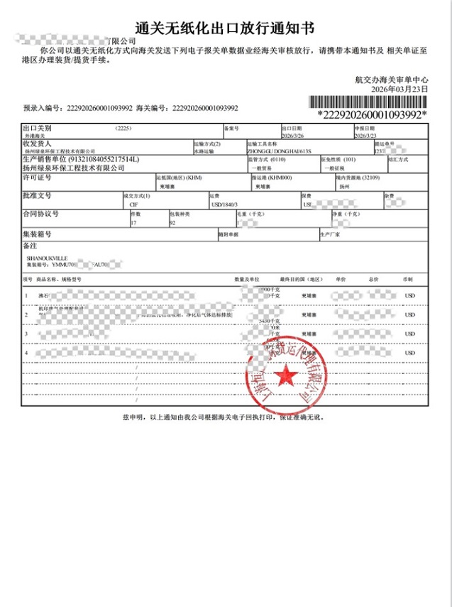 Según se informa, el cronograma para esta entrega fue ajustado y altamente eficiente. El día 22, el equipo fue recogido con éxito e inmediatamente cargado en un barco ese mismo día. Posteriormente, el portaaviones zarpó con éxito el día 26, transportando el equipo a Camboya por vía fluvial. Esta entrega no solo demuestra las capacidades de ejecución altamente eficientes de Lvquan Environmental en la gestión logística transfronteriza, sino que también muestra su posición tecnológica líder en el campo del tratamiento de gases residuales industriales para la industria gráfica.