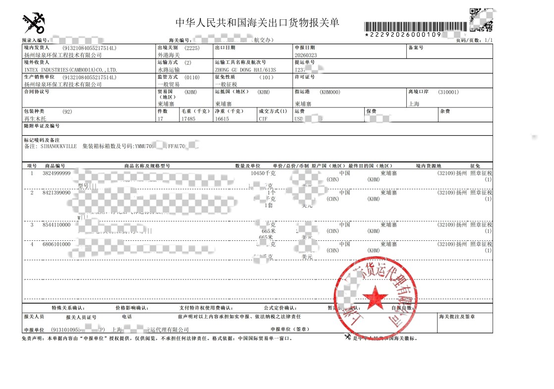 Ver detalles[Phnom Penh, Camboya, 22 de marzo de 2026] — Lvquan Environmental Protection Engineering Technology Co., Ltd. completó recientemente con éxito una importante entrega transfronteriza, suministrando un conjunto de equipos avanzados de tratamiento de gases de escape de impresión a su cliente camboyano, INTEX INDUSTRIES (CAMBODIA) CO., LTD.